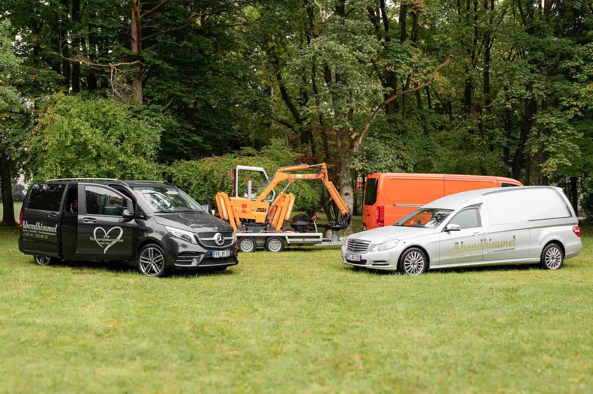 Mit unserem Sprinter und dem Anhänger transportieren wir unseren Bagger sowie unsere Grabtechnik als „Grabmacherei mit Herz“ zum Beisetzungsort. Dort angekommen, erstellen wir das Erd- oder Urnengrab und richten die letzte Ruhestätte für die Beisetzung ein.